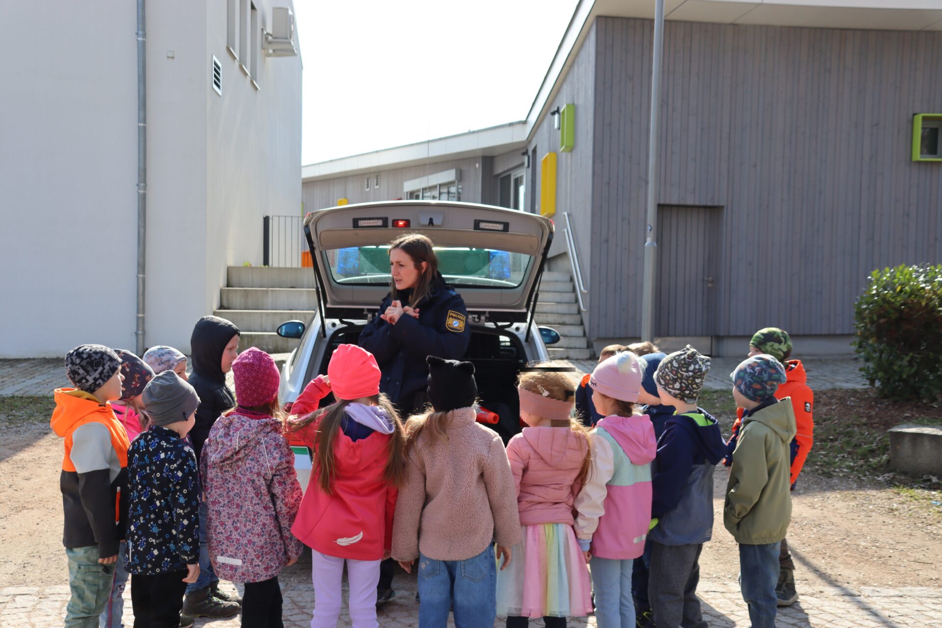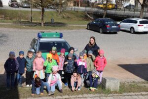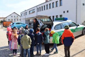 Am vergangenen Montag freuten sich unsere Schulanfänger über besonderen Besuch. Im Rahmen der Verkehrserziehung lernten die Kinder, wie man sicher die Straße überquert und warum helle Kleidung und reflektierende Elemente im Straßenverkehr so wichtig sind. Sie durften das Polizeiauto von innen und außen ganz genau anschauen, den Schlagstock anfassen und die Polizei-Mütze tragen. Auch die Handschellen durften die Kinder ausprobieren. Mit anschaulichen Beispielen und viel Geduld vermittelte die Polizistin den Kindern die Wichtigkeit des Sicherheitssystemes bei der Mitfahrt im Auto.